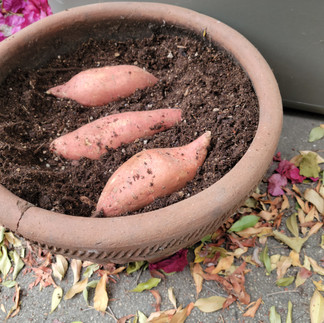Today, I finally got around to removing the sweet potato vine slip from the mother tuber in the terra cotta pot in the courtyard (pictured below) and establishing it in a pretty glazed pot, so that it might serve as a house plant. But not just any ol’ house plant. Oh, no. As my Time Bank friends Kelly Coyne and Erik Knutzen exclaim in their 2010 classic Making It: Radical Home Ec for a Post-Consumer World, sweet potatoes are “the Filipino Epiphany ... an urban farmer’s Holy Grail: a houseplant that feeds you.”